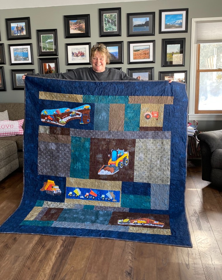 I’ve got some projects in the making, but none are complete to share with you. What project is complete is this quilt for a special little boy, Elliot. I have had the best time teaching his Grandma Kathy quilting. We started with her idea of a construction equipment quilt and this with what we ended with.
