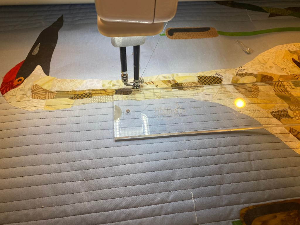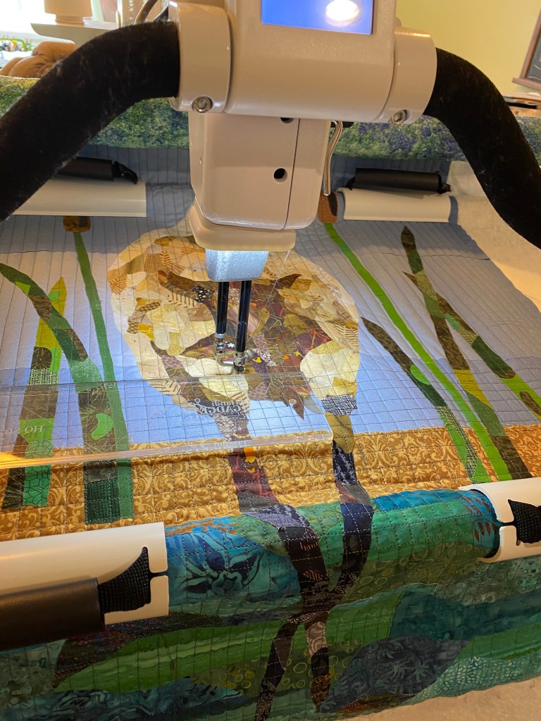 Like most of my collage quilts, figuring out the background takes awhile, usually as long as the collage itself. Water, sand and sky for this one.