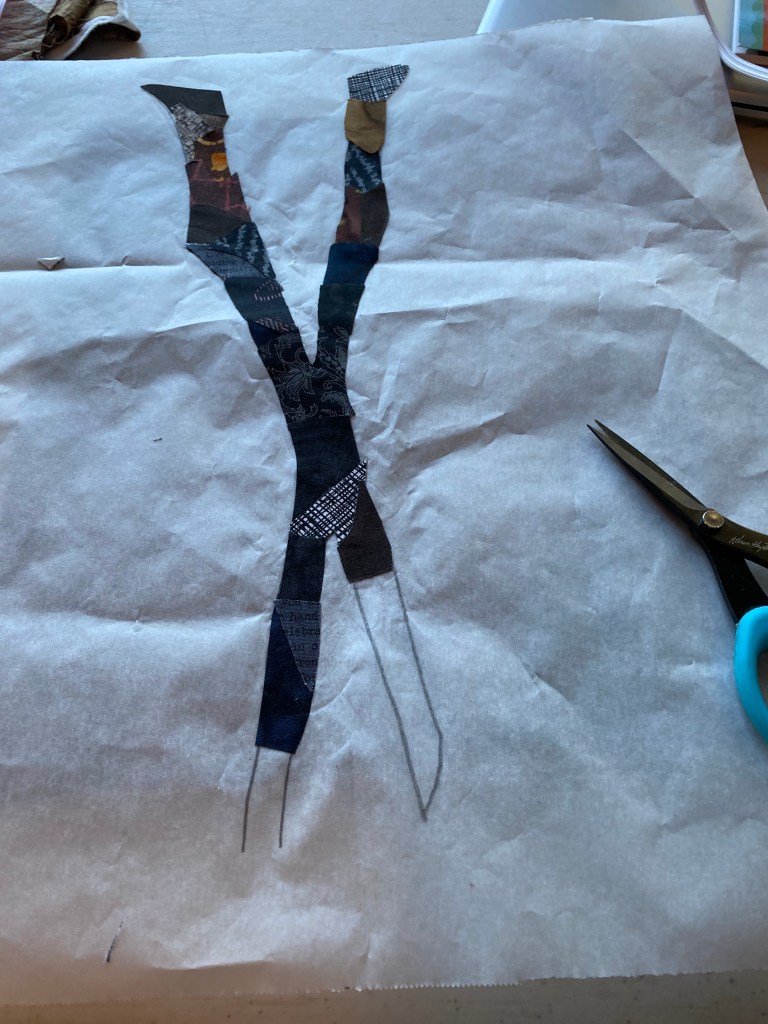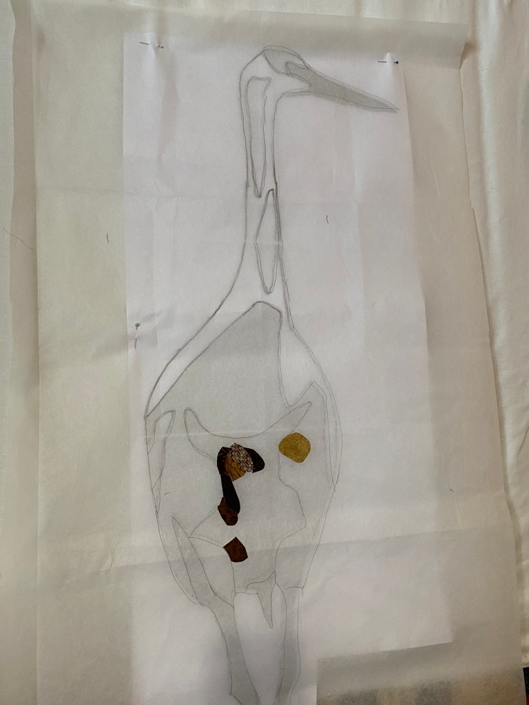 I traced this bird on Pattern Ease. When doing collage, the beginning of the project is actually quite boring. I’ve heard many beginners say they don’t know where to start. My advice is put some pieces of fabric on, if you don’t like it it’s easy to change.