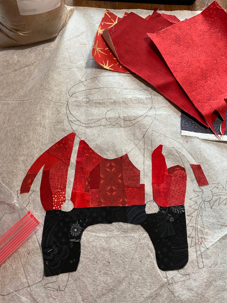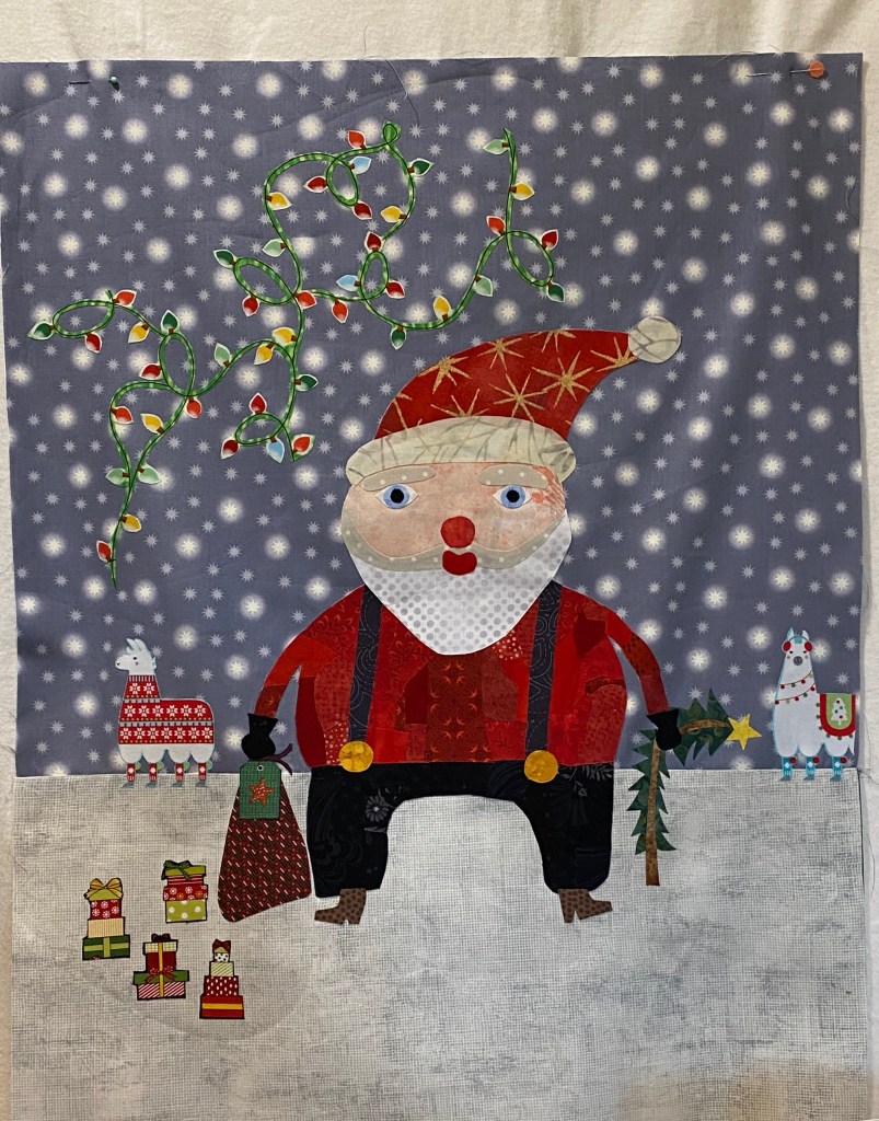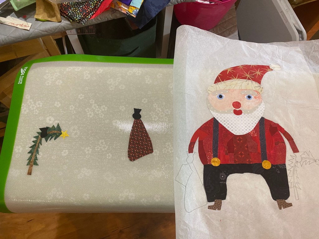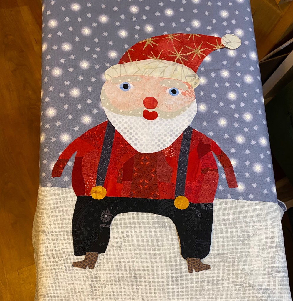 While Laura does give instructions to collage the background as well as the motif, I cut Santa out of the pattern ease and put him on the background I had already sewn together.