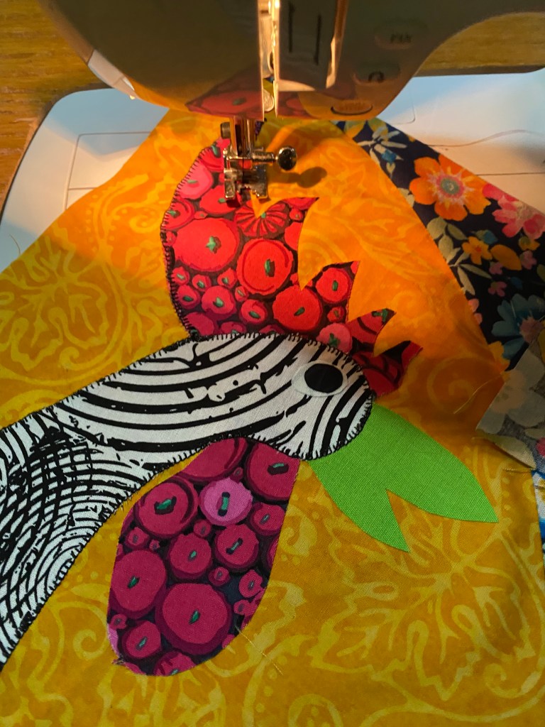 I’m stitching around my roosters.
