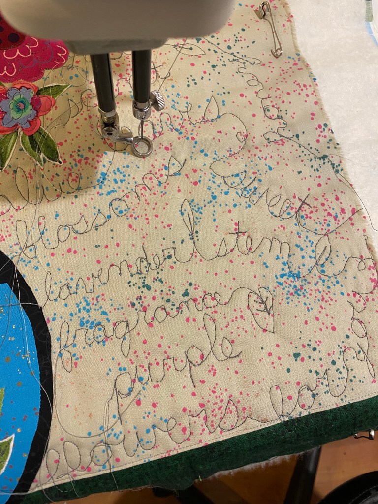 Quilting on the background of my collage flowers in a vase.