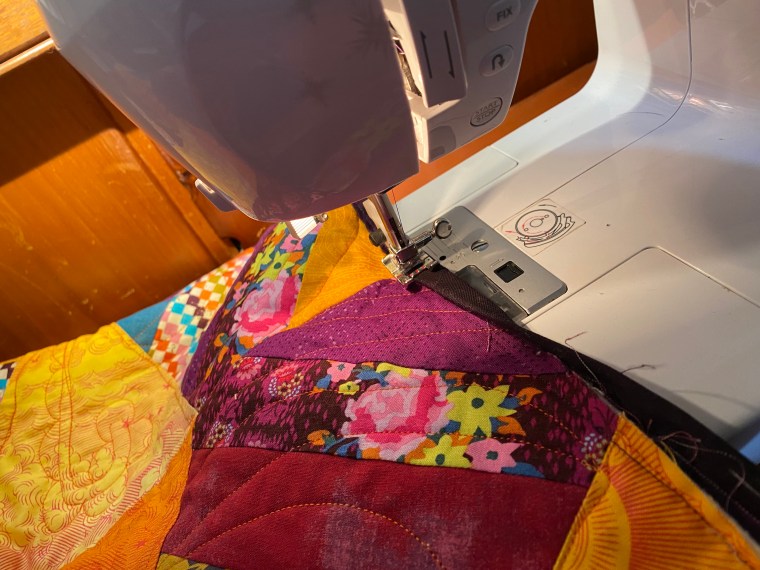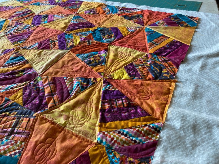 I finished quilting and was just about to start trimming off the excess. Look closely at the top right corner of this picture, you’ll see I failed to quilt one piece of the block. Back to the Sweet Sixteen.