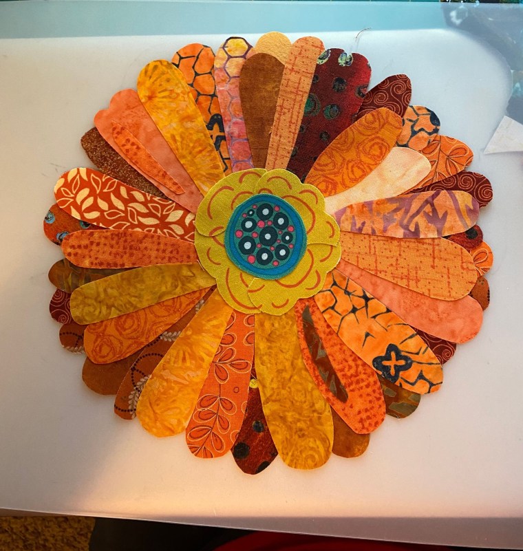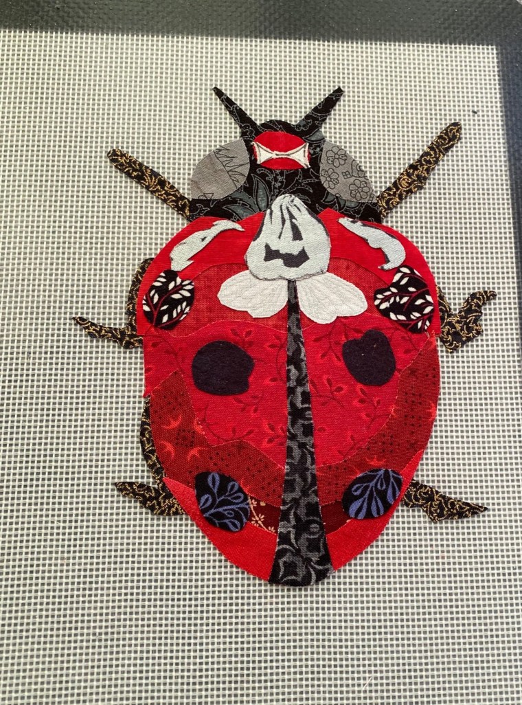 This is a pattern from Emily Taylor of Collage Quilter. This was a sew along. We got a new pattern each week for 12 weeks. I chose to only make nine of them. It probably won’t surprise you that I didn’t keep up each week. Emily designed this pattern to quilt each block, then put the blocks together. In fact, Emily has a video on YouTube showing you how to join those quilted blocks to make the quilt. That being said, I didn’t make it that way. I wanted my backgrounds to be made from the same fabrics, then I’d quilt it after the top was done. So I started with the Ladybug on my silicone mat.