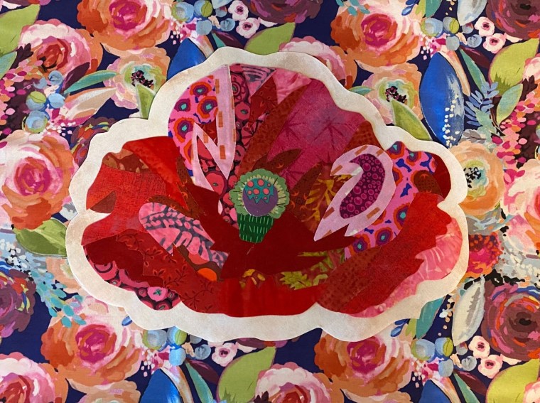 I tried out a bunch of different fabrics for backgrounds. Here’s one that I thought she blended into too much. With all the work of each collage, I wanted them to stand out.