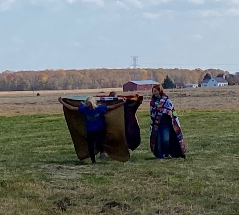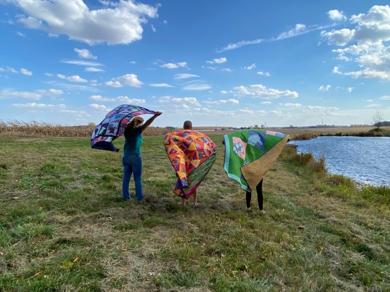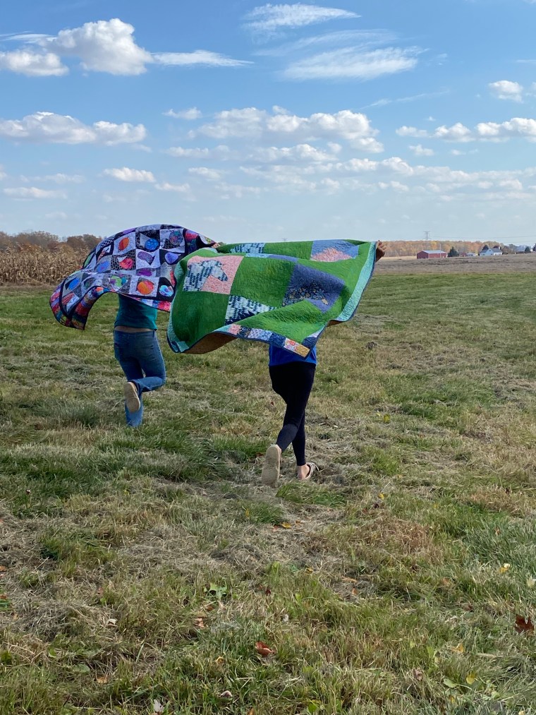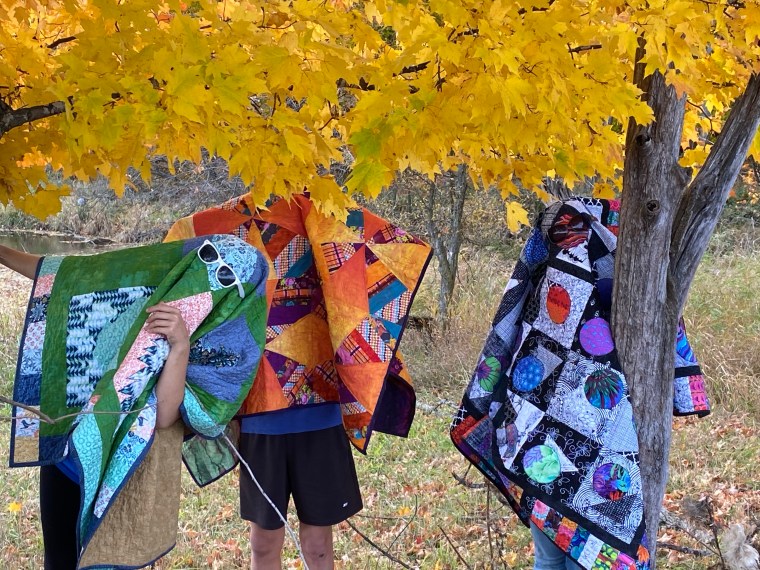 Perfect fall day in Michigan. I got three of my grandkids to play with quilts in the wild. Love seeing my quilts in the woods, by the pond and in our cornfield. My husband and I chose to live and work this farm. My sons and their families have also stayed near by. We are blessed.