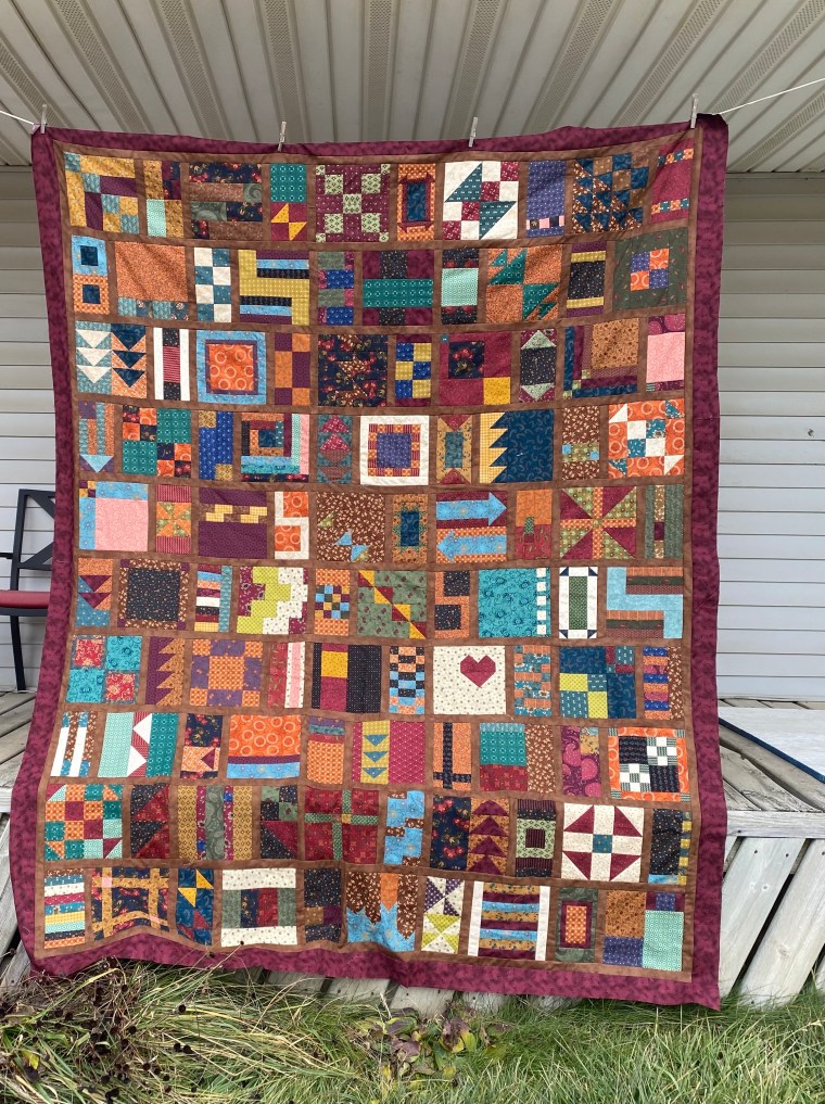Kinship is 100 different blocks. This one took me about two years to make. I’ve been hauling a tote all over this country sewing blocks together.