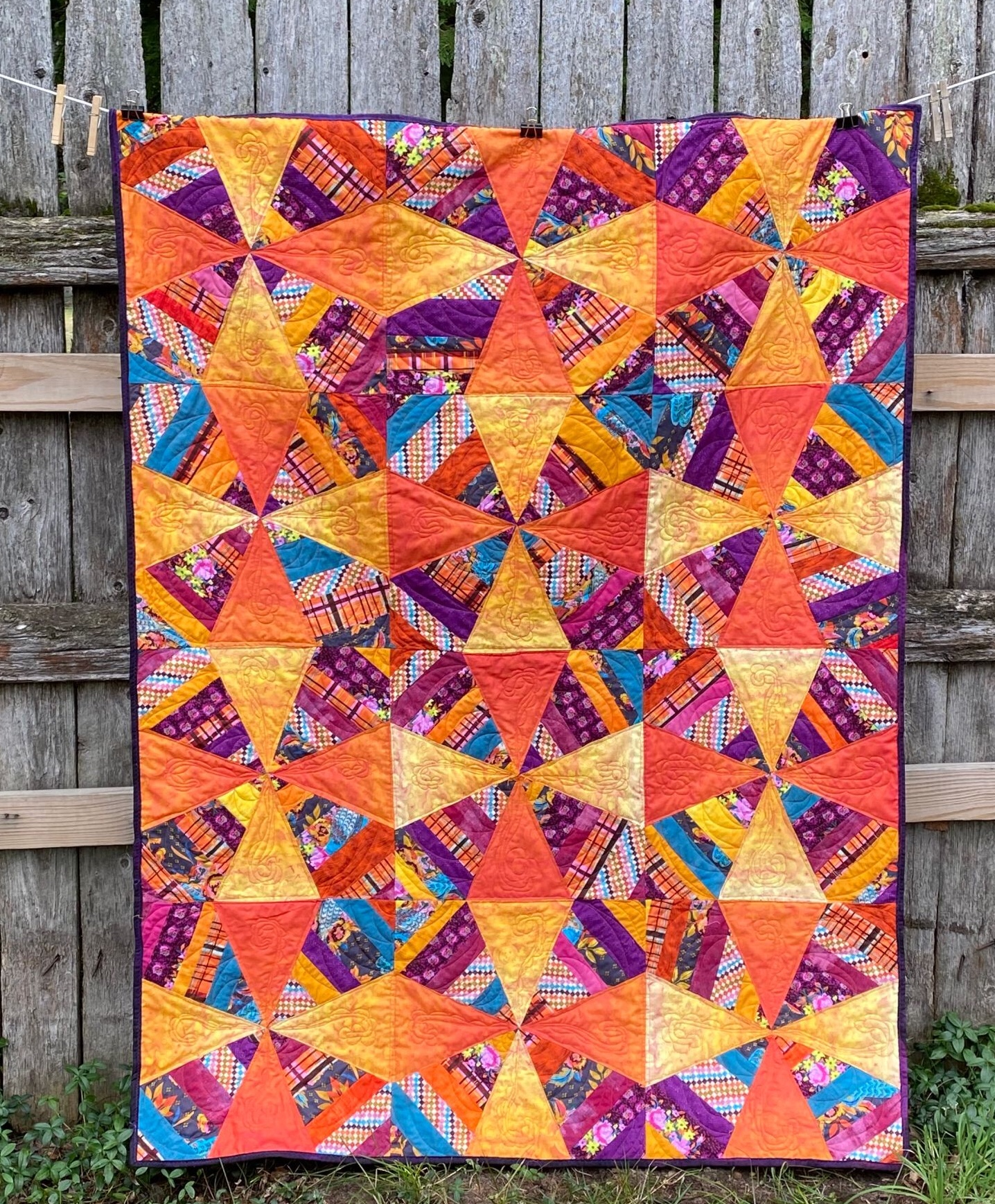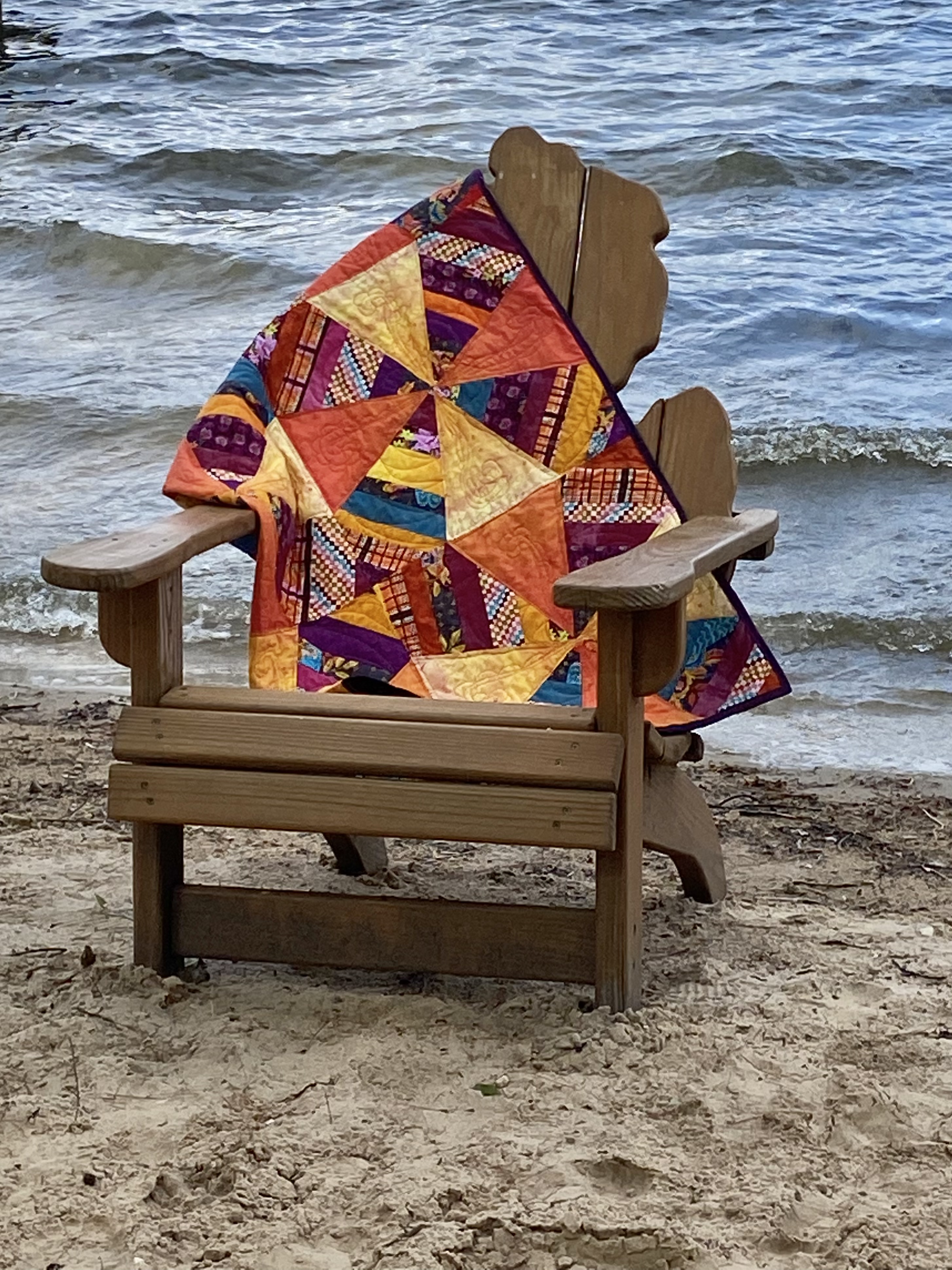 Finished and hanging on the fence at the lake. I think this will be the perfect fall quilt to use while watching those football games.