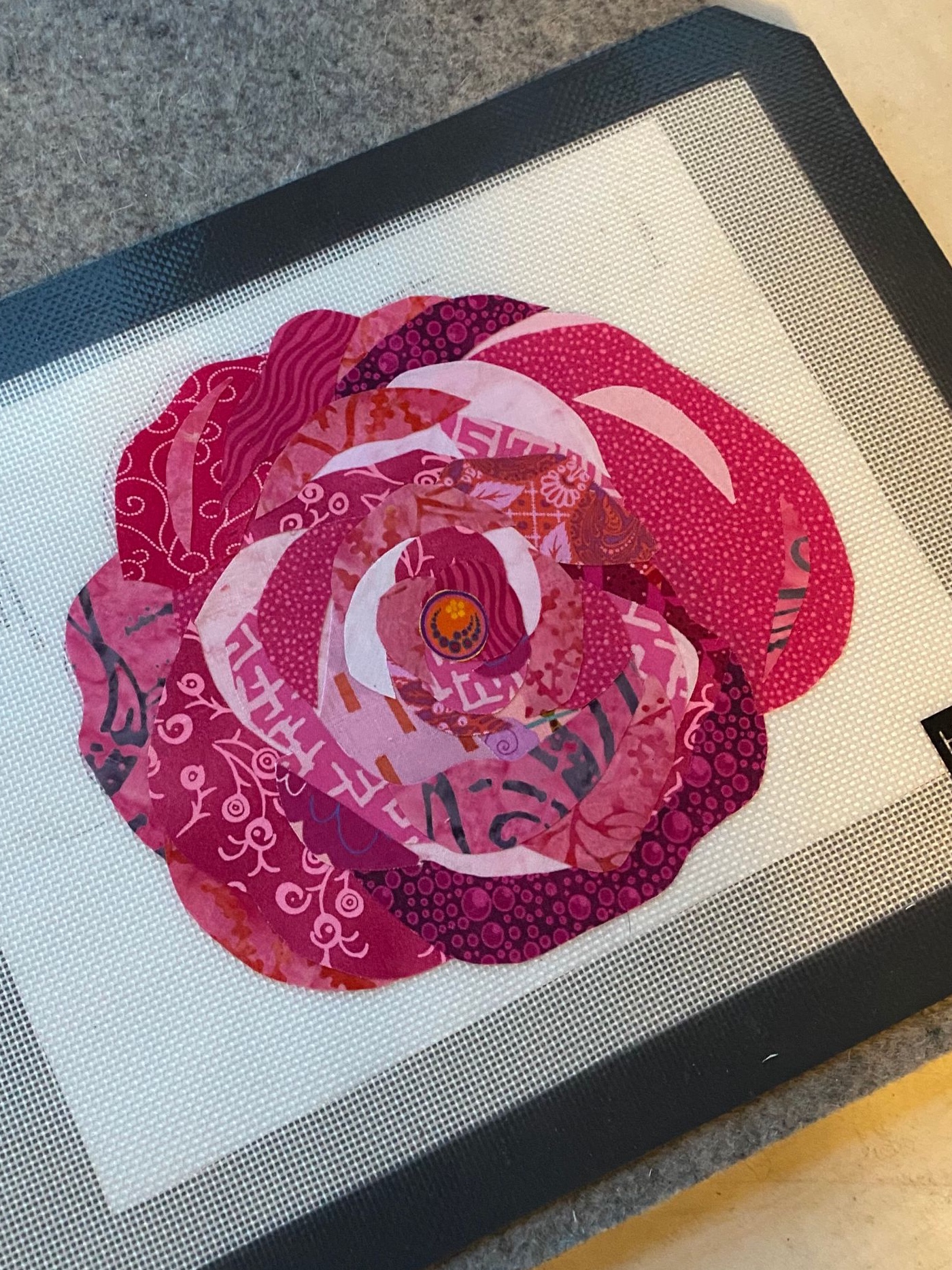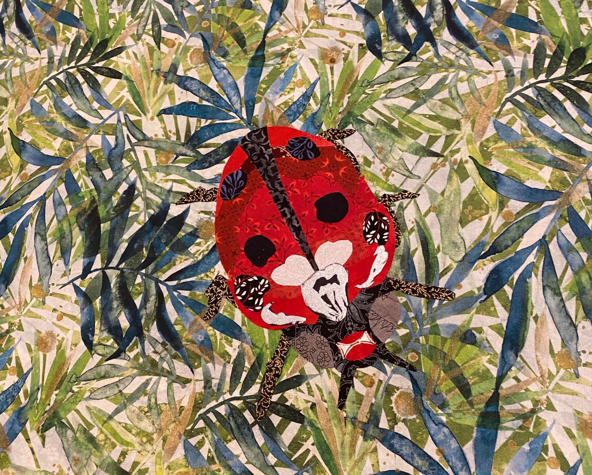 This is a pattern from Emily Taylor of Collage Quilter. This was a sew along. We got a new pattern each week for 12 weeks. I chose to only make nine of them. It probably won’t surprise you that I didn’t keep up each week. Emily designed this pattern to quilt each block, then put the blocks together. In fact, Emily has a video on YouTube showing you how to join those quilted blocks to make the quilt. That being said, I didn’t make it that way. I wanted my backgrounds to be made from the same fabrics, then I’d quilt it after the top was done. So I started with the Ladybug on my silicone mat.