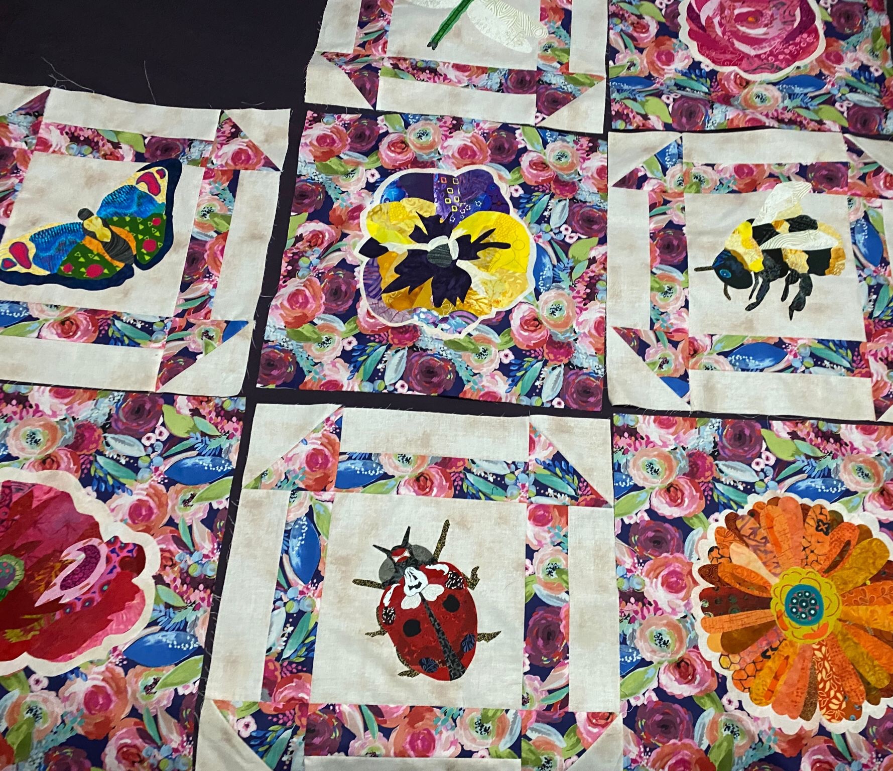 Finally I decided each of the bugs would be in the middle of a churn dash block. Each of the flowers would be outlined and put on a solid block of the flowery fabrics I had found at my local quilt shop when in Gaylord, Delphines Quilt Shop.
