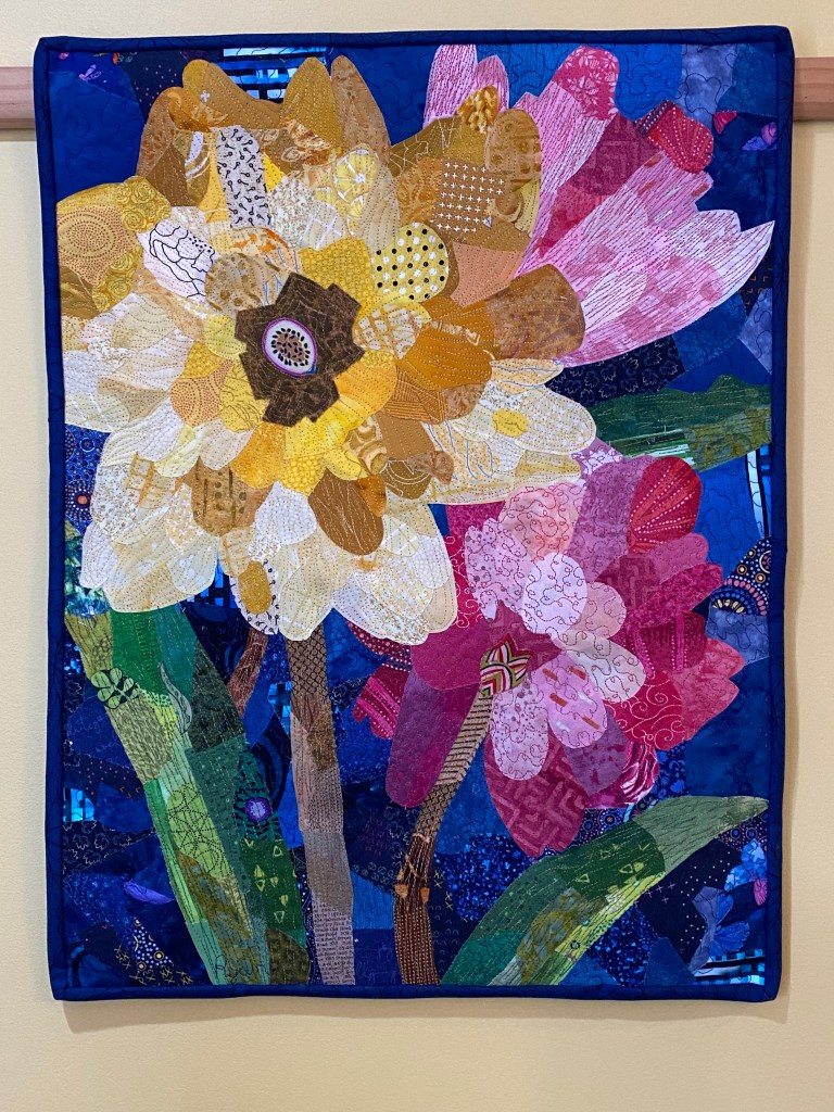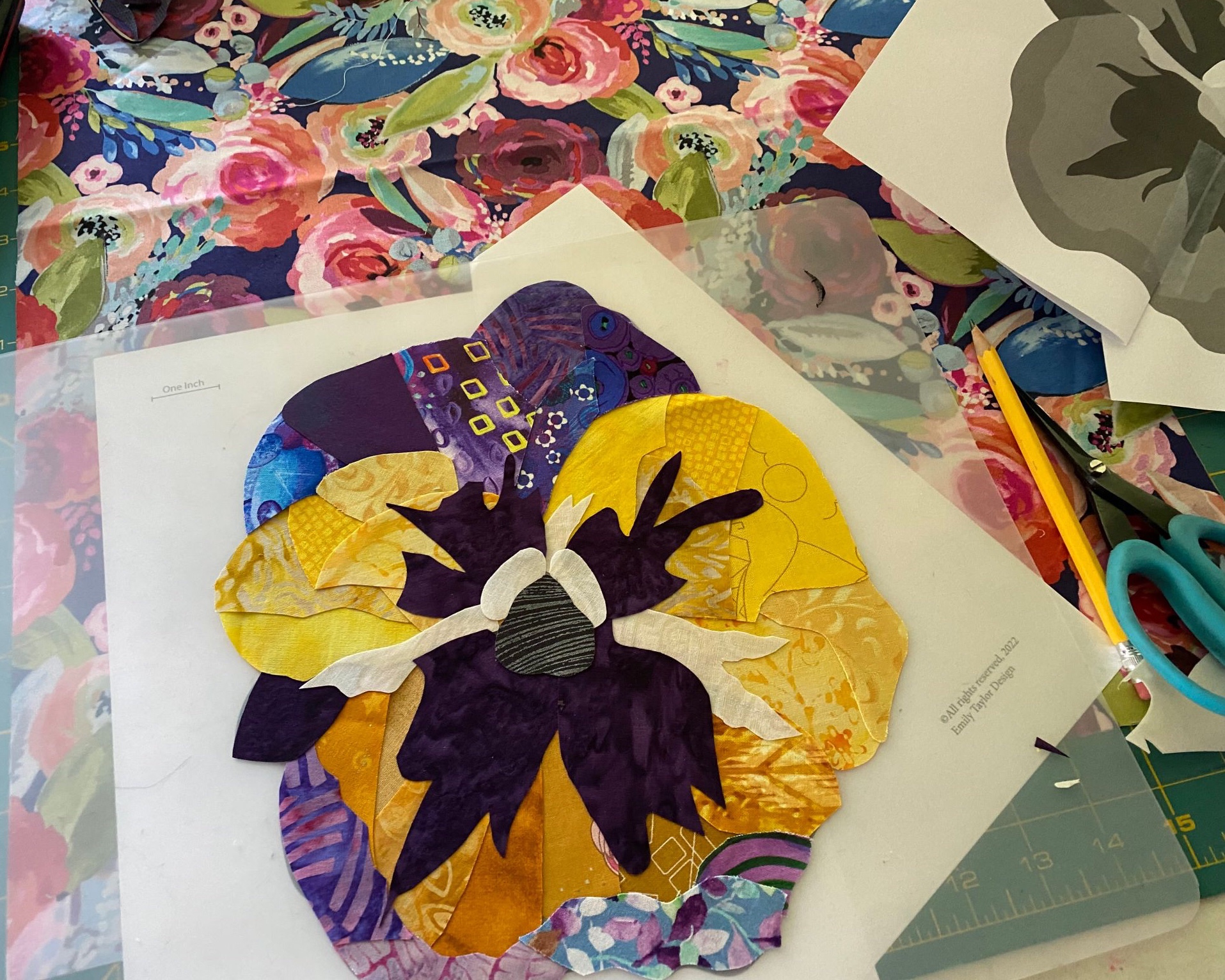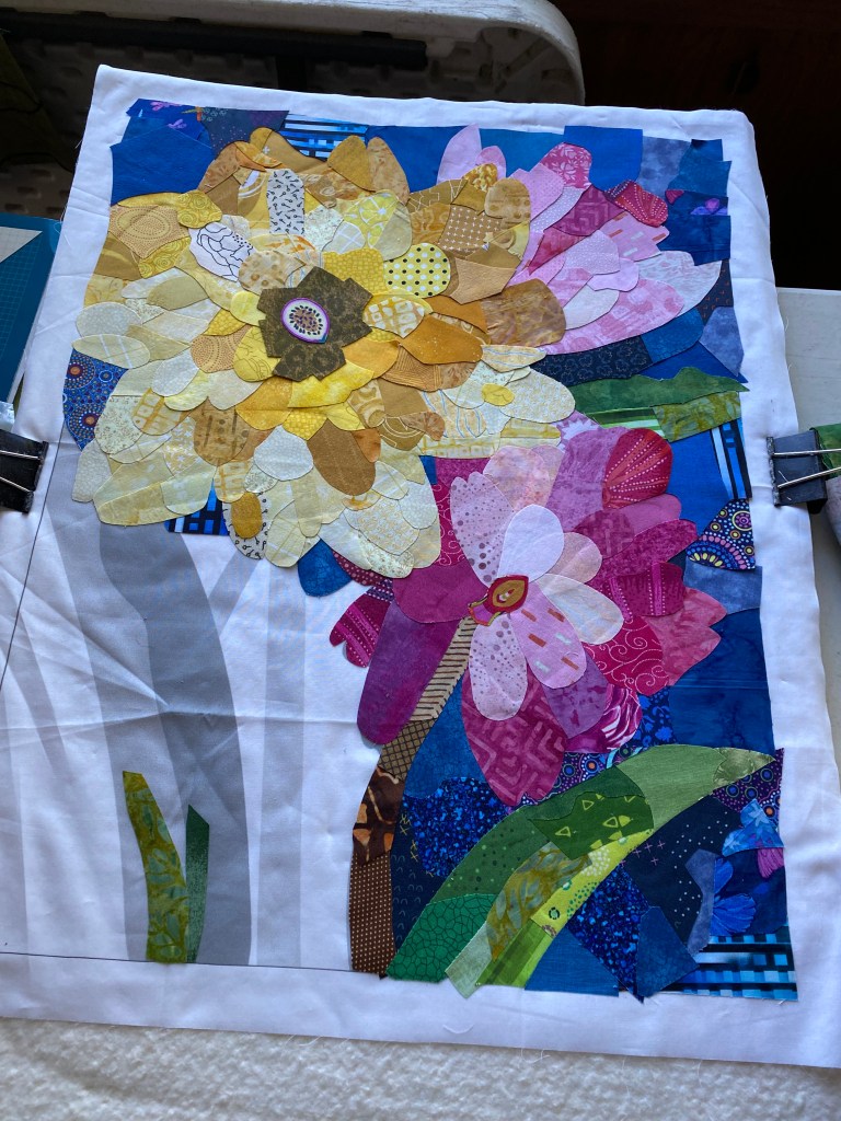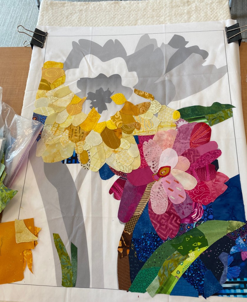 This is my first experience making the quilt with one of Emily’s foundation panel patterns. These patterns are printed on muslin. So not only do you collage the flowers, but also the background.