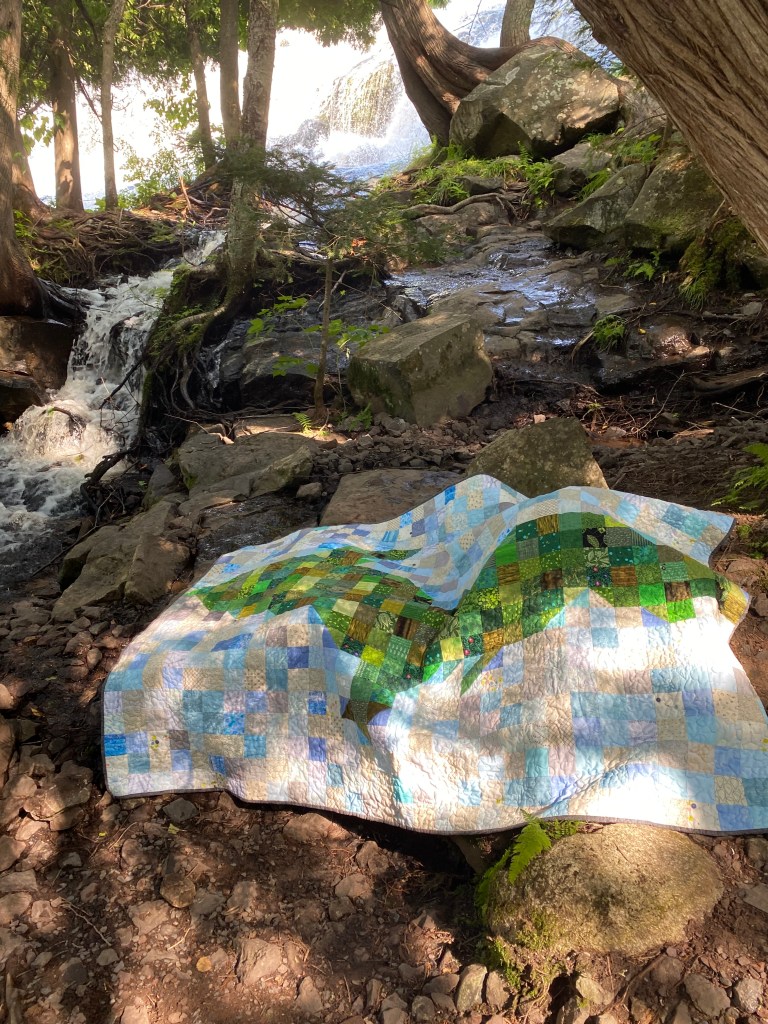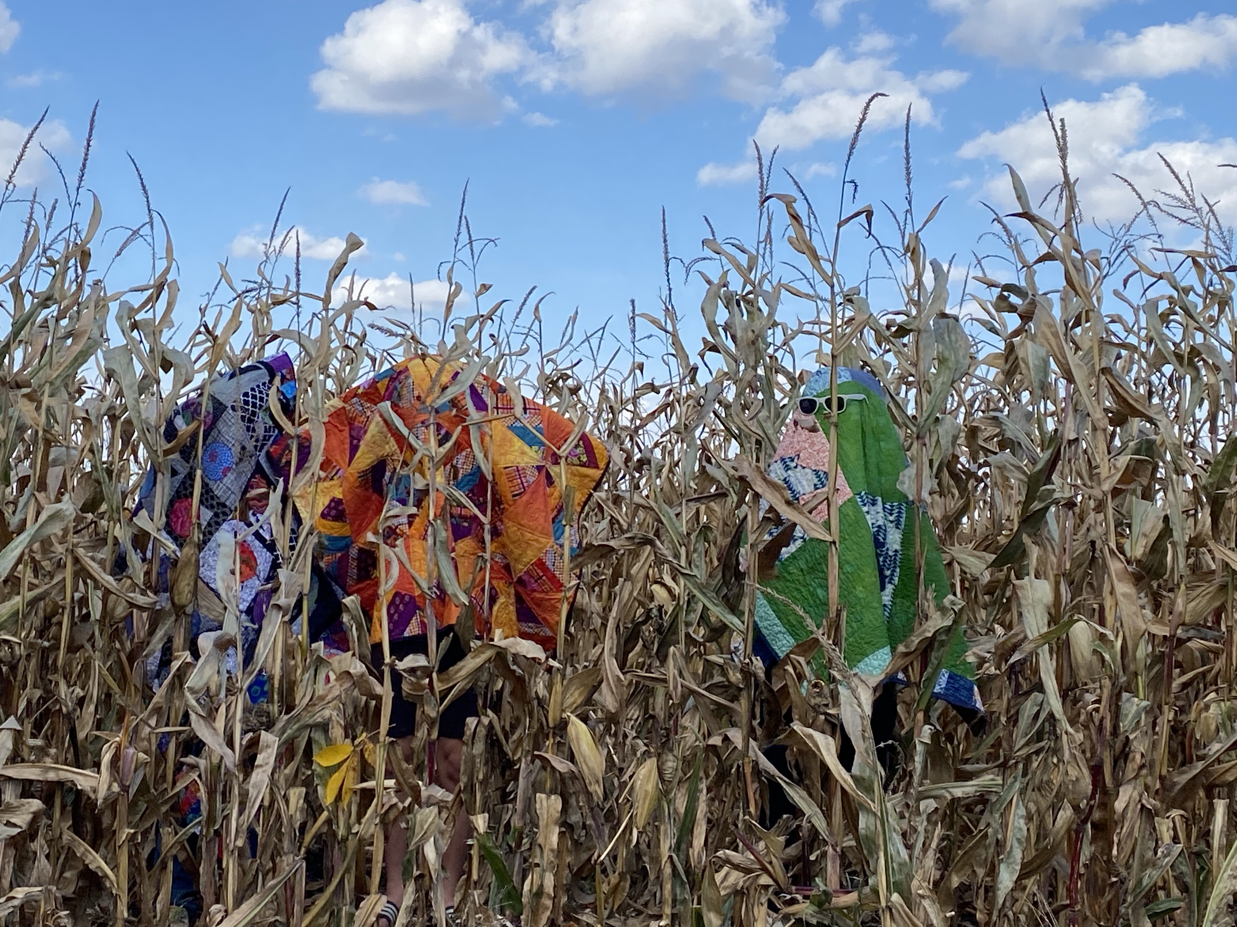 Perfect fall day in Michigan. I got three of my grandkids to play with quilts in the wild. Love seeing my quilts in the woods, by the pond and in our cornfield. My husband and I chose to live and work this farm. My sons and their families have also stayed near by. We are blessed.