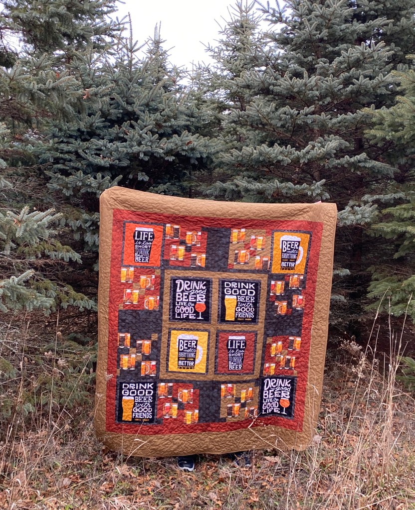 I bought the beer panel years ago at the Houston Quilt Show. This one is a surprise for my husband. I’m rather surprised he never saw it while I had in on the quilting machine. It has soft Cuddle fabric on the back. Now I can put away the quilt he usually covers up in, a hand quilted off-white quilt I made over 36 years ago. It’s getting pretty thin and I need to repair the binding.