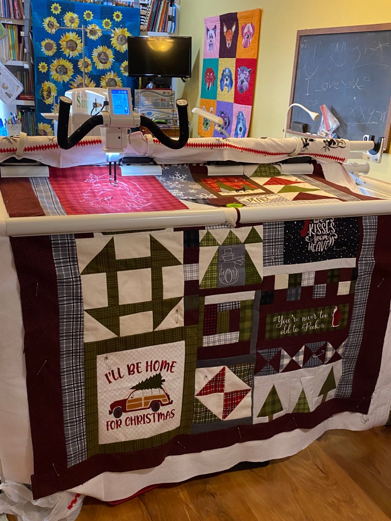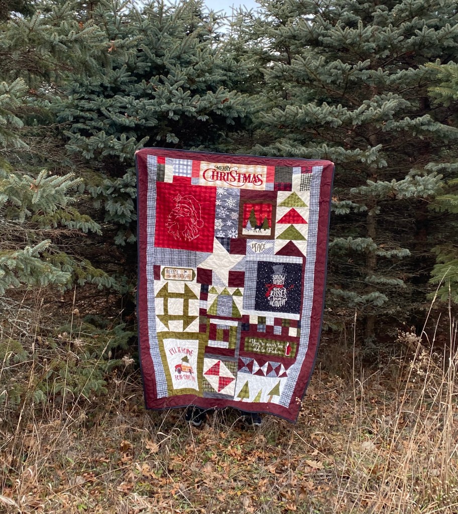 I live in rural Michigan. At my local quilt show, Seven Sisters Quilt Shop they have a Deer Hunter’s widow sale at the beginning of firearm deer season. Since I’m a hunter, I don’t get to the store first thing in the morning. But it’s a sale I don’t want to miss. They always have tasty food, interesting demos and good sales. This year I saw the flannel Christmas panel on display, asked where they were in the store only to find out it was the last one. Needless to say I didn’t put it down. I thought it would be a quick to make Christmas quilt. But I was wrong.