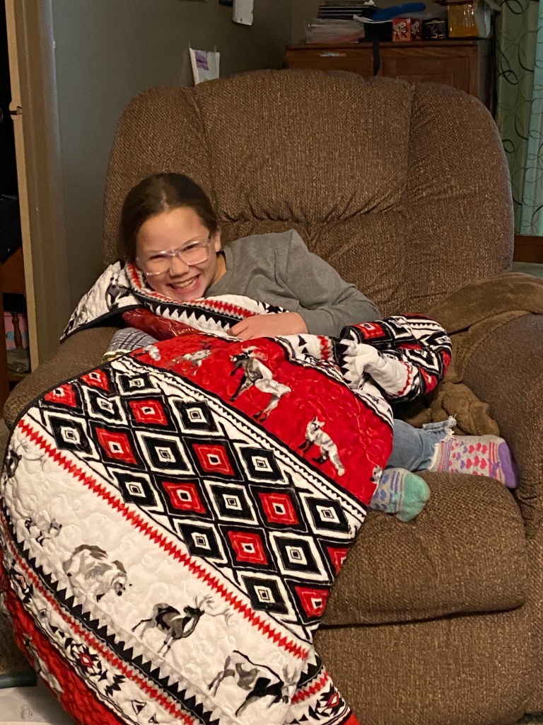 I have to admit that I made a terrible mess when I made the quilt sandwich for these three quilts. Cuddle fabric does that. It also makes another mess when trimming off the excess and squaring up the quilt. But it quilts really easily and my grandkids (and the adults too) love it. We really use the quilts I make.