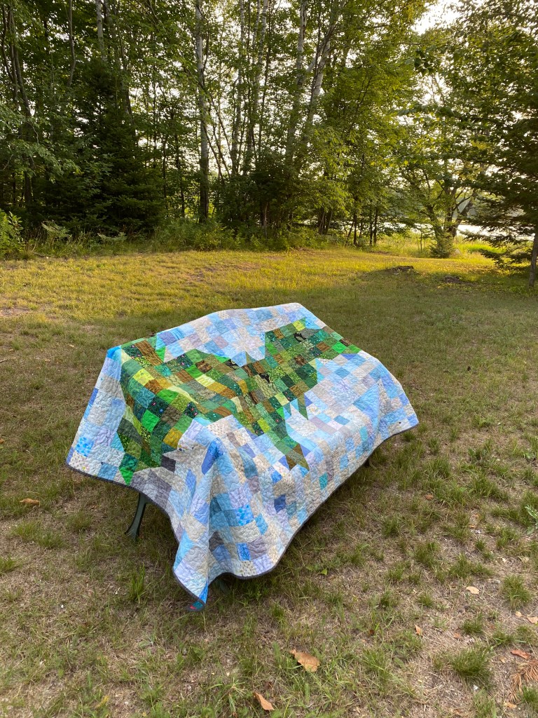 I had hoped to get this quilt completed before we got to the Upper Peninsula. Notice the tower in the background of the photo above, we are actually on the Mackinaw Bridge and I still have over a foot to sew. As it turned out, there was a backup at the toll booth on the north side of the bridge and I got the quilt finished just in time.