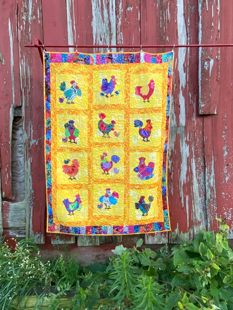 I found this quilt pattern this summer at my local quilt shop, Seven Sisters Quilt Shop. Had to buy it quick, even though I had three other projects already going at the time. In fact, you can see the pattern in a photo on another post while I was working on chickens.