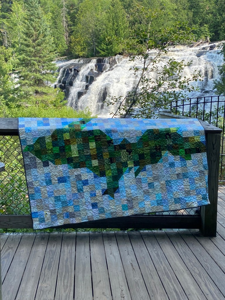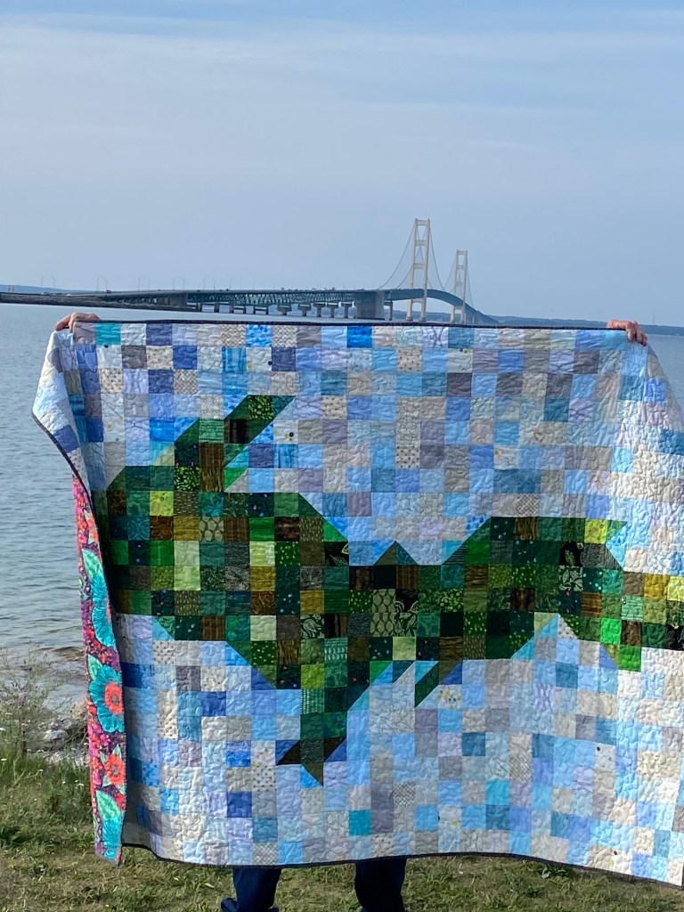 Our last stop as we head south was the rest stop on the west side of the Mackinaw Bridge. My husband may have thought I was crazy hauling this quilt all over the U.P. and taking photos, but he participated and obviously used it to stay warm.