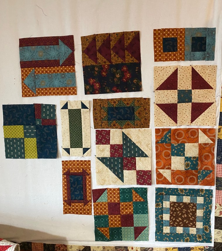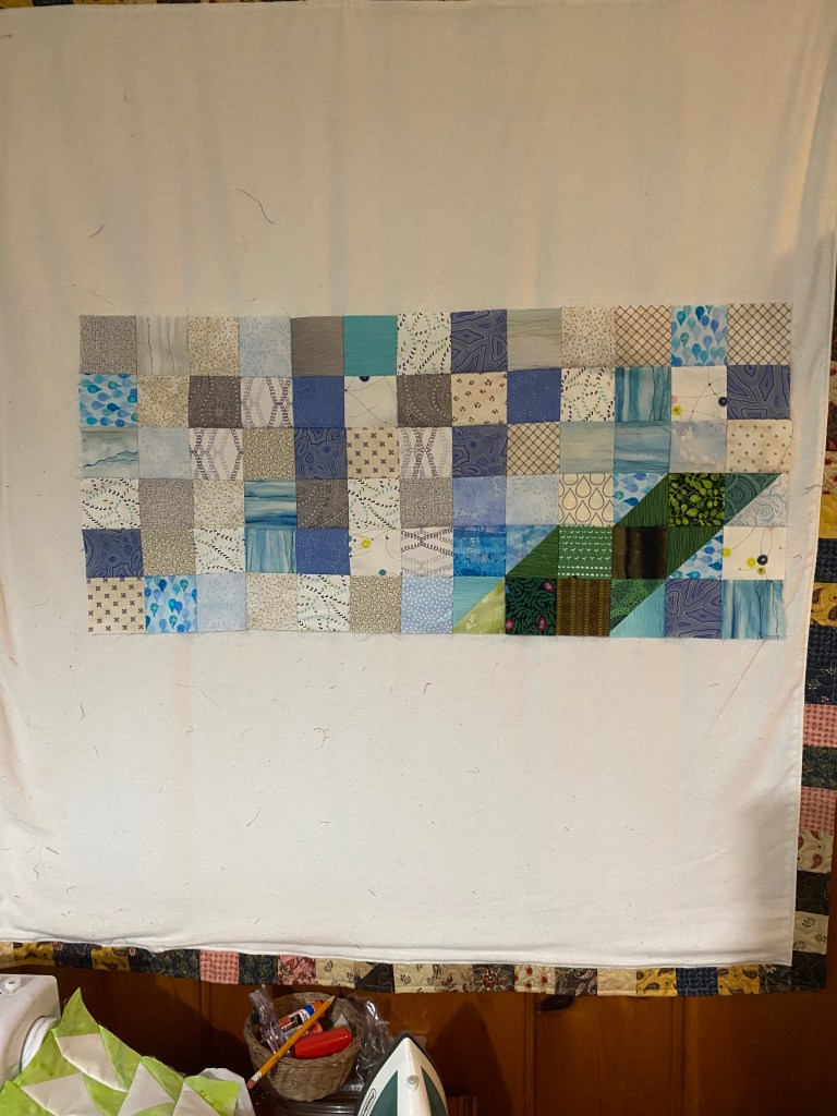 Now to lay out the blocks. Then sew the blocks together and add borders. Ready to make the quilt sandwich.